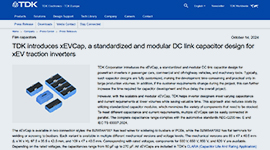 The TDK xEVCap is a standardized and modular DC link capacitor design for powertrain inverters in passenger cars, commercial and off-highway vehicles, and machinery tools. Typically, such capacitor designs are fully customized, making the development time-consuming and practical only in large production volumes. However, with the scalable and modular xEVCap, TDK helps inverter designers meet varying capacitance and current requirements at lower volumes while saving valuable time.